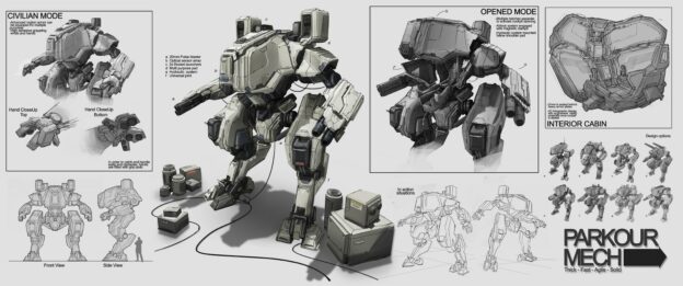 Если в концепте присутствуют элементы, которые не удается раскрыть на ключевом и вторичном кадре, то стоит сделать для них дополнительные эскизы. Здесь можно изобразить оружие и сложные элементы экипировки, показать, как они будут выглядеть под разными углами. К примеру, если у персонажа в прыжке раскрываются механические крылья, то хотя бы схематически стоит изобразить, как они будут выглядеть в сложенном и разложенном состоянии.
