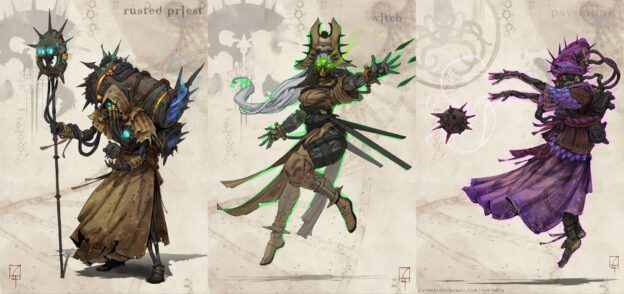 Как правило, сначала художник разрабатывает основу в виде архетипа героя. Архетип отвечает на вопрос, какую роль персонаж будет выполнять: бандита, монаха, мага или кого-то другого. Затем Скотт прибавляет персонажу различные особенности внешности, которые бросятся в глаза игроку: тыква на месте головы, огромная коса, монструозный щит и так далее.