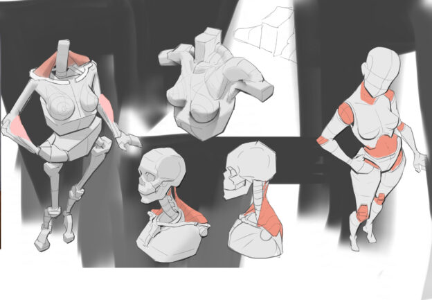 На примерах ниже можно увидеть, что практиковаться в рисовании анатомии в перспективе не так уж и сложно. Сначала нужно подобрать референс, и на его основе создать блочную схему персонажа — начните с элементарных цилиндров и кубов, а потом объединяйте их в блоки.
