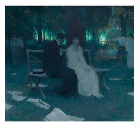 Девушка написана в более светлых тонах, поэтому Данн поместил ее на фоне темного объекта (дерева). Мужчина же имеет более темные тона, поэтому у него более светлый, освещенный фон.