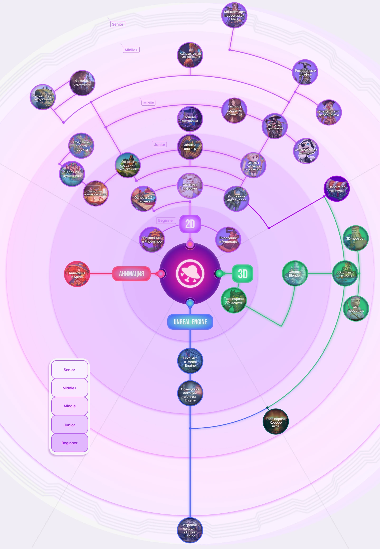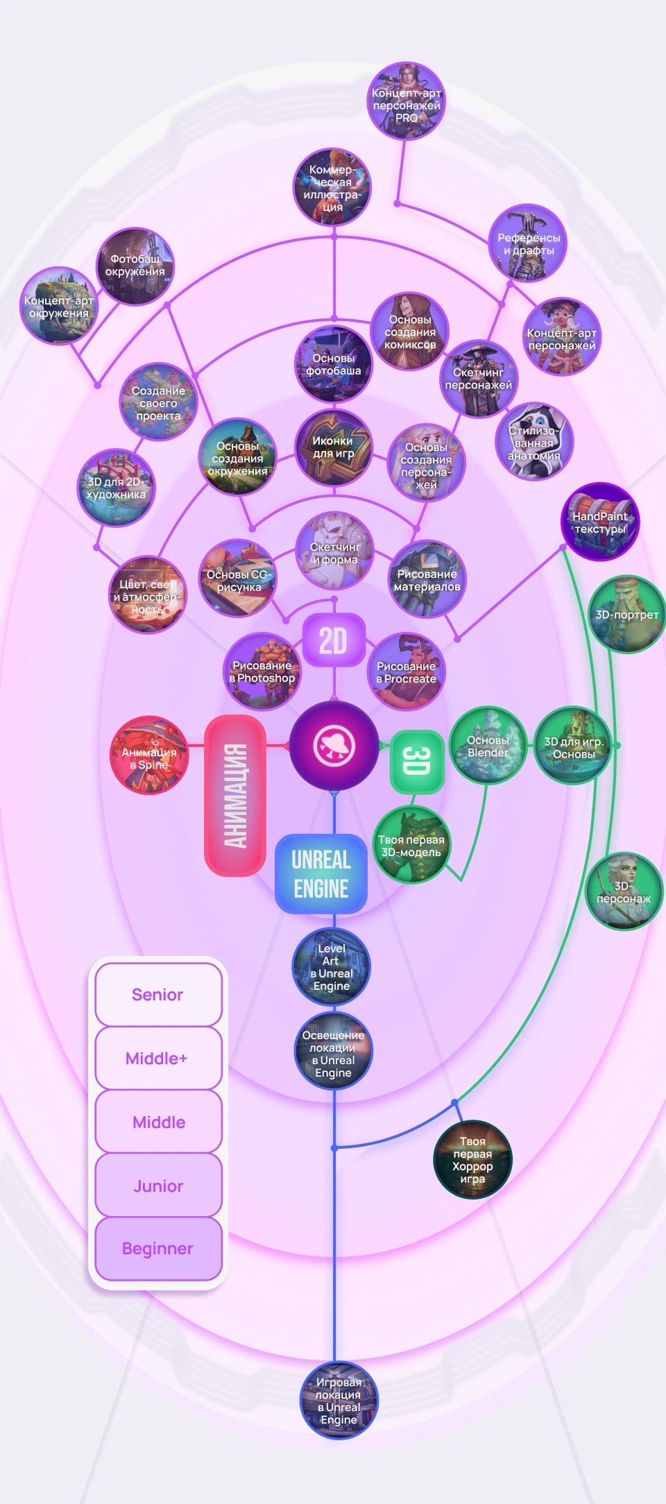 Рисование в Photoshop, Рисование в Procreate, Основы CG-рисунка, Скетчинг и форма, Рисование материалов, UI-дизайн: иконки для игр, Основы фотобаша, Основы создания персонажей, Основы создания окружения, Стилизованная анатомия, Концепт-арт персонажей, Референсы и драфты, Концепт-арт персонажей PRO, Концепт-арт окружения, Коммерческая иллюстрация, 3D для 2D-художника, Фотобаш окружения, Создание своего проекта, Цвет, свет и атмосферность, Основы Blender, 3D для игр. Основы, 3D-персонаж, Твоя первая хоррор-игра, Level Art в Unreal Engine, Освещение в Unreal Engine, Игровая локация в Unreal Engine, Анимация в Spine, Основы создания комиксов, Hand-paint текстуры